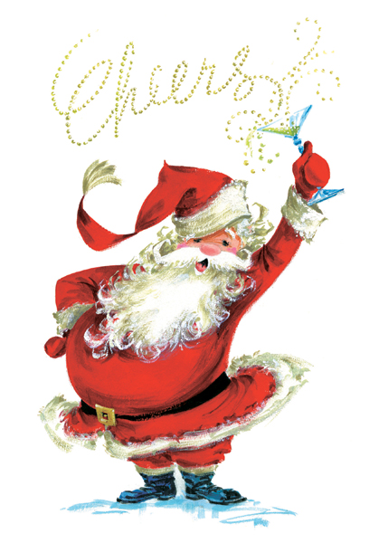 Santa with champagne glass and gold bubble spelling out Cheers digital