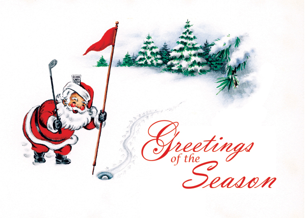 Santa holding the pin as a ball makes a path through the snow Greetings of the Season caption in printed red Digital