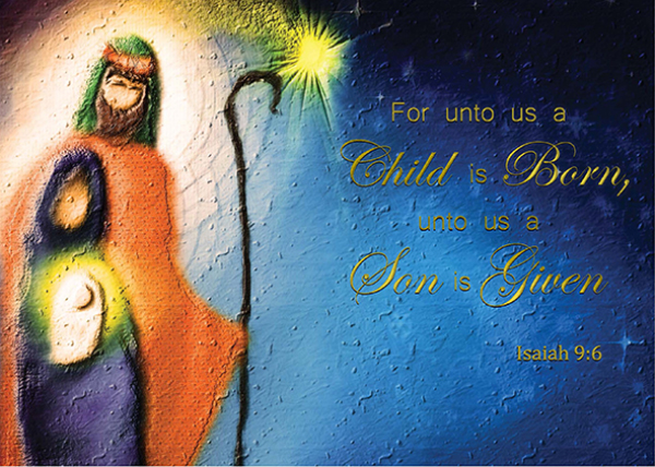 Abstract Mary and Joseph on canvas-like faux texture. Gold foil For Unto Us a Child is Born caption