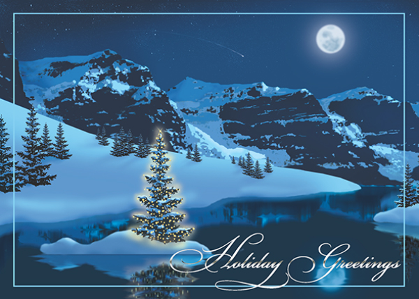 Alaskan moonlight with decorated tree on ice floe. HG in silver foil