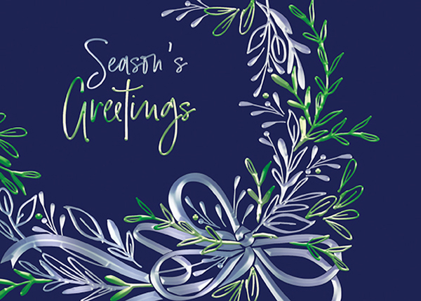 Partial wreath in open, flat foils with SG caption-Silver and lime green on printed blue background