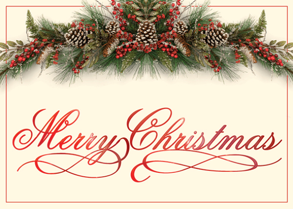 Merry Christmas caption in red foil on ivory under Christmas garland
