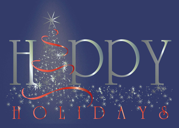 Happy Holiday caption in silver foil with tree forming letter A, with red foil caption and garland on Blue
