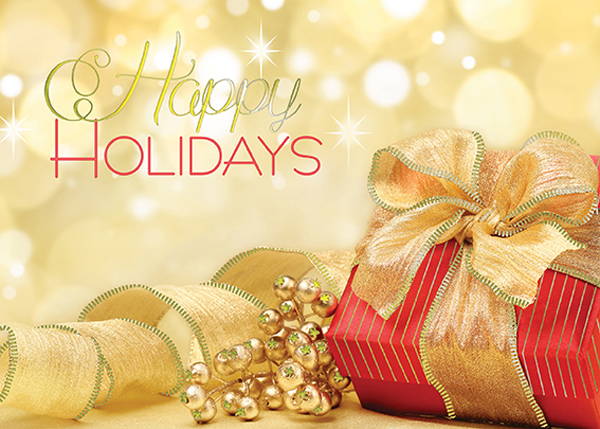 Red package w/gold foil ribbon highliights and background HH (Happy in gold foil)