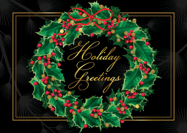 green large pine leafed wreath with gold and red berries HG gold foil caption and dbl keyline on black background