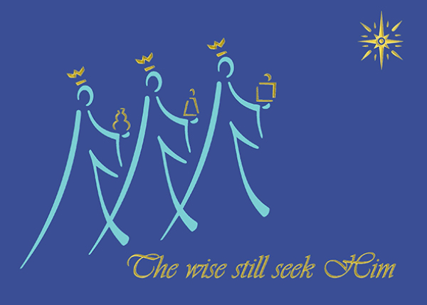 Light blue on blue soft-touch outline Magi with gold foil The Wise Still Seek Him caption and highlights