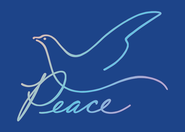 Silver prismatic foil outline dove with Peace caption on printed blue