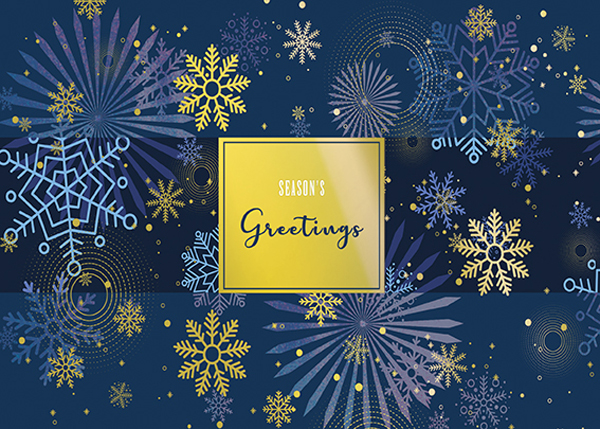 Season's Greetings dropped from flat foil with snowflake strip and glitter snowflake drop out