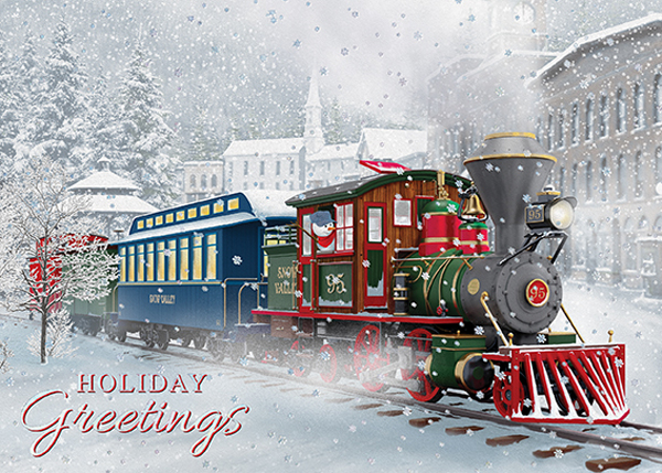 Train in winter scene-Happy Holidays caption, silver prismatic foil