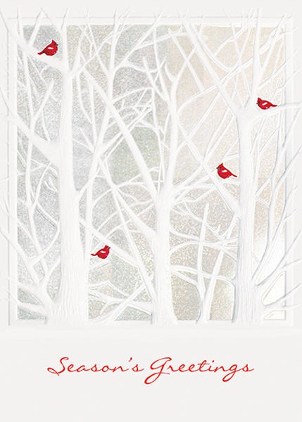Red cardinals in trees/blind emboss trees/clear prismatic foil background
