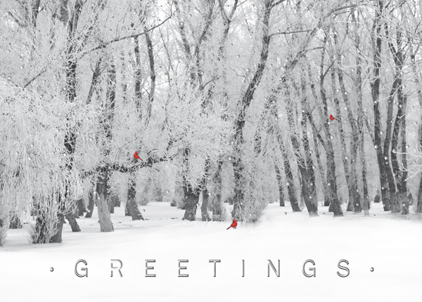 Winter treeline with cardinal, silver foil Greetings caption and highlights