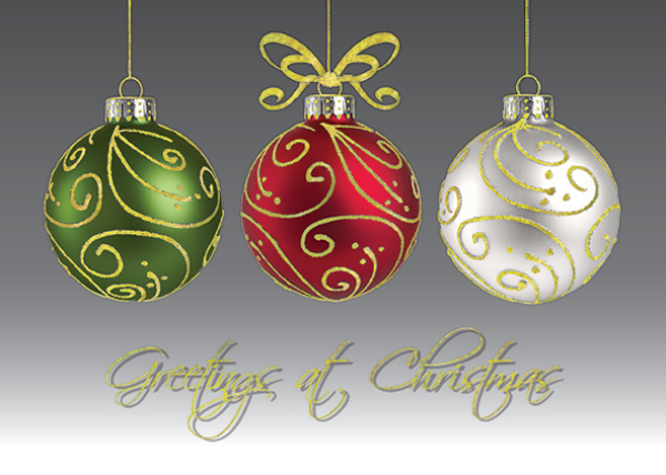 Silver, red, green hanging ornaments with gold foil highlights and Greetings at Christmas caption