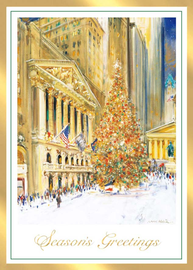 Outside the New York Stock Exchange, a huge Christmas tree is on display as captured by Kamil Kubik in this lovely Christmas at The Exchange Card. Unique touches include rich, full-color imagery with gold foil accents on gloss stock.