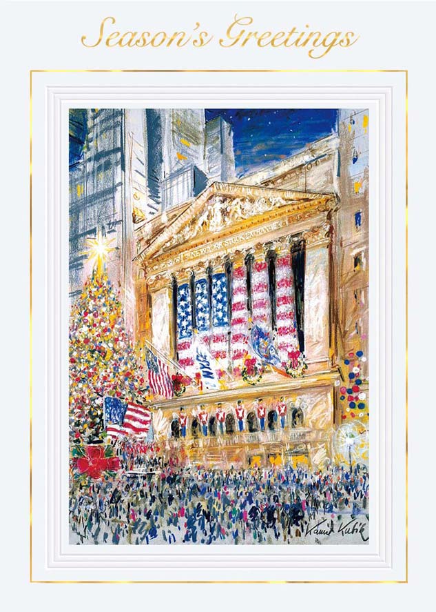 Celebrating the season in style, the Icons of Tradition Holiday Card proudly features a brightly decorated Christmas tree on display in front of the New York Stock Exchange. Unique touches include rich, colorful imagery with an embossed frame and gold foil accents on gloss stock.