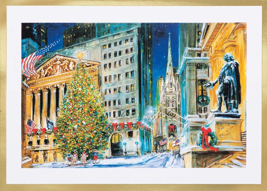 Beautifully designed, the Silent Night at the NYSE Card features a nighttime scene of the New York Stock Exchange decorated for Christmas as painted by Kamil Kubik. Unique touches include rich, full-color imagery with gold foil accents on gloss stock.