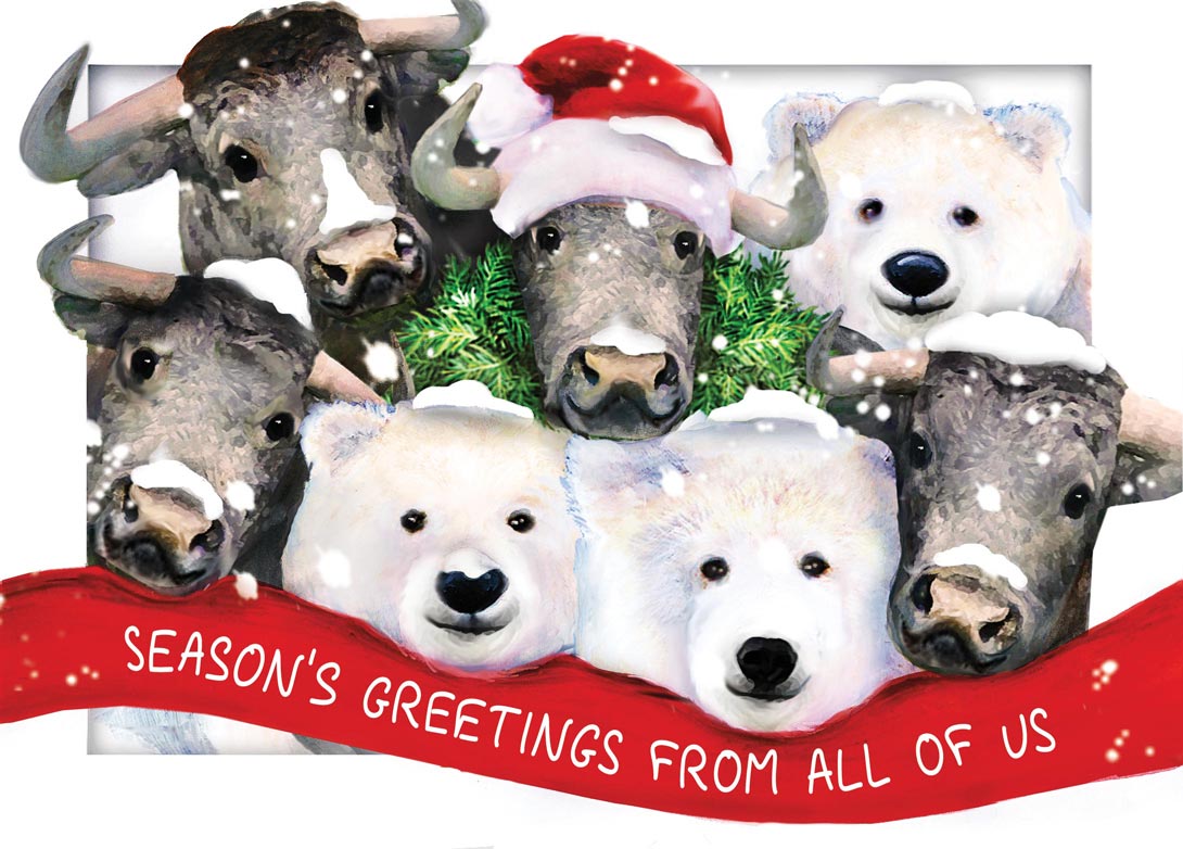 A cheerful group of bears and bulls in The Whole Lot Holiday Card wishes your recipients Season's Greetings. Unique touches include rich, colorful imagery. Choose from three high-quality paper stocks: Signature White, Premium White or Pearl Shimmer; additional charges may apply.