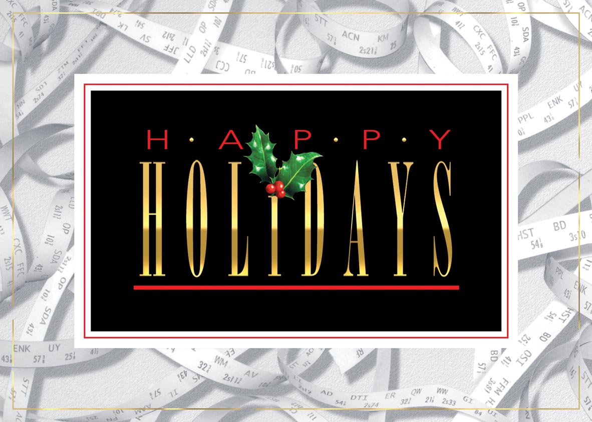 This classic style Holiday Greetings card with ticker tape background has gold foil imprinted on coated stock.