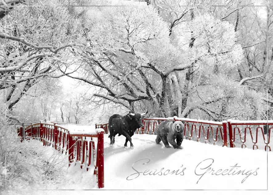 The Wall Street Cards bear and bull are enjoying a winter stroll in this beautiful snowy design with silver foil accents on coated stock.