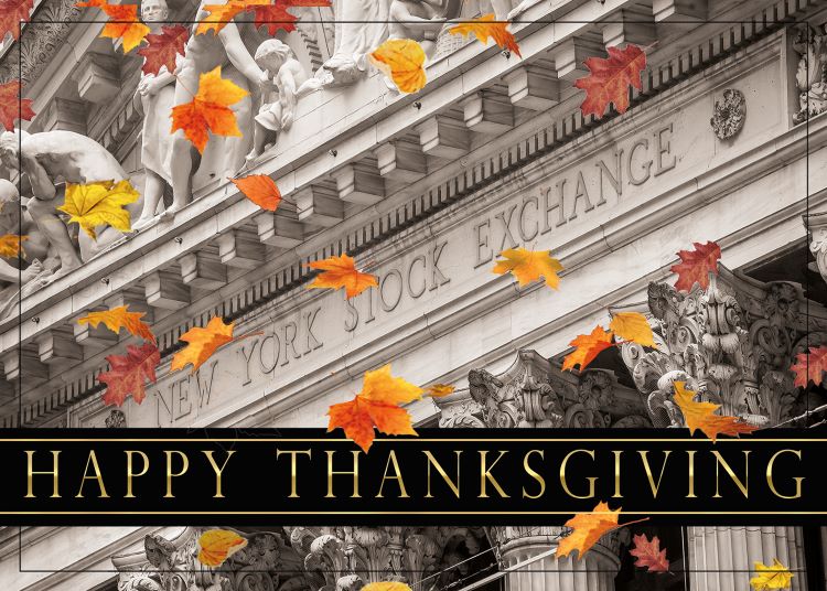 The New York Stock Exchange is showered in autum leaves in this beautiful Thanksgiving Card that is sure to please your clients. There is no gold foil on this card. Choose from three high-quality paper stocks; additoinal charges may apply.