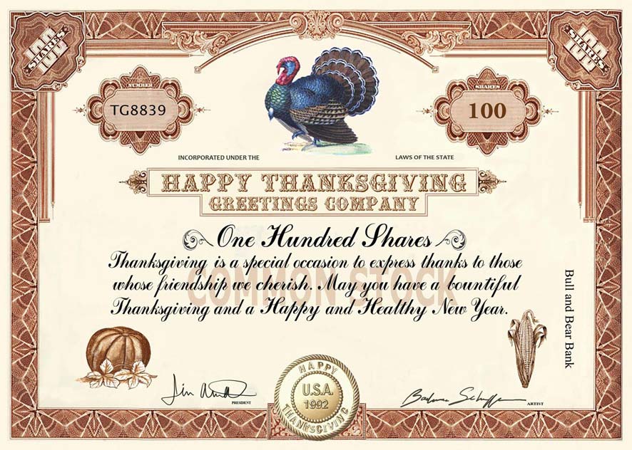 The high-quality Thanksgiving Stock Certificate Card is a facetiously official way to delight every client on your mailing list with a personalized message. Unique touches include rich, full-color imagery with gold foil accents on gloss stock.